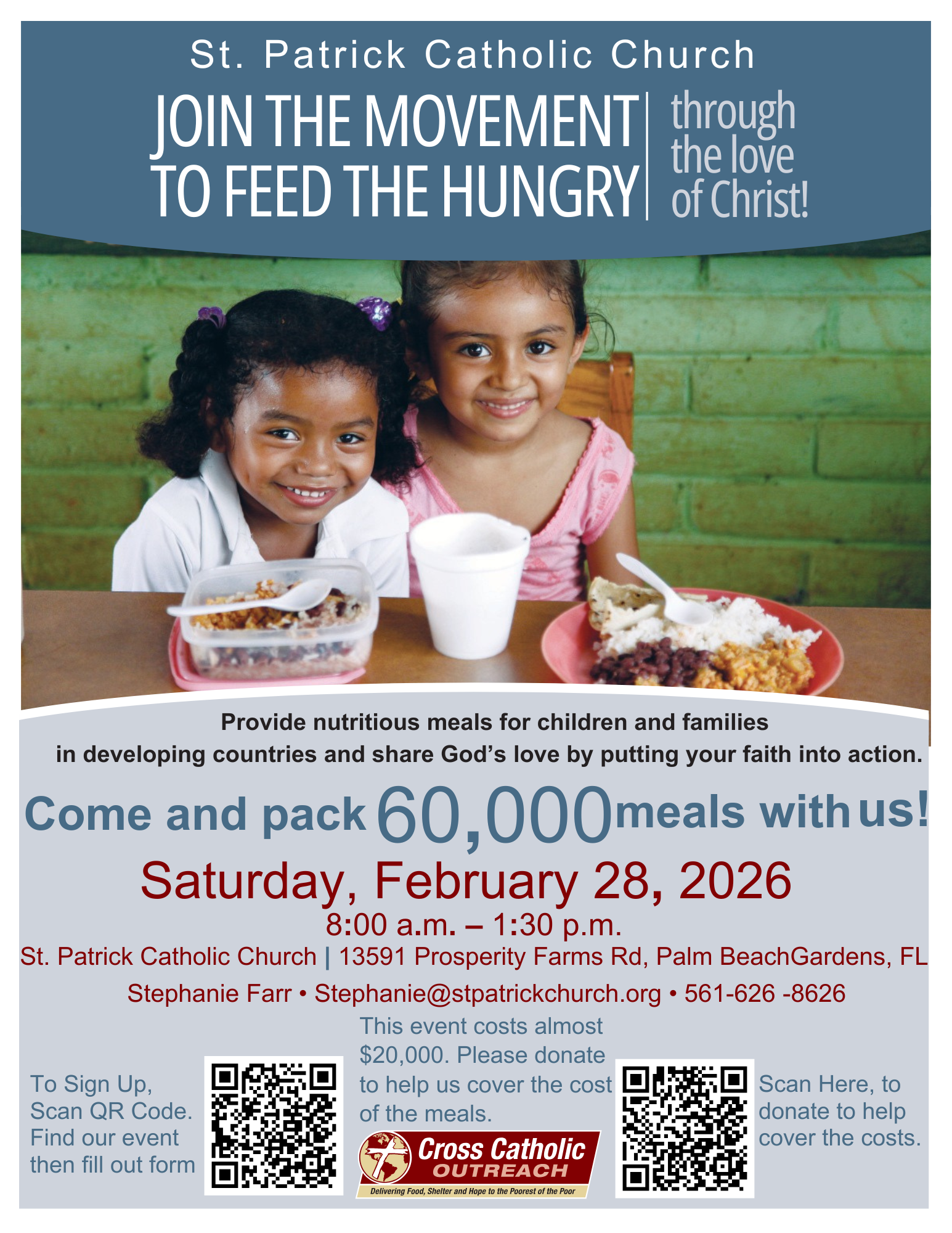 To help fight the scourge of hunger in developing countries, Cross Catholic Outreach is partnering with St. Patrick Catholic Church's Confirmation Candidates to pack 60,000 Vitafood meals. These nutrient-rich meals, designed by a nutritionist, will feed children and families in a poverty-stricken country for just 33 cents a meal. Our Goal for 60,000 meals at 33 cents a meal is $19,800.00